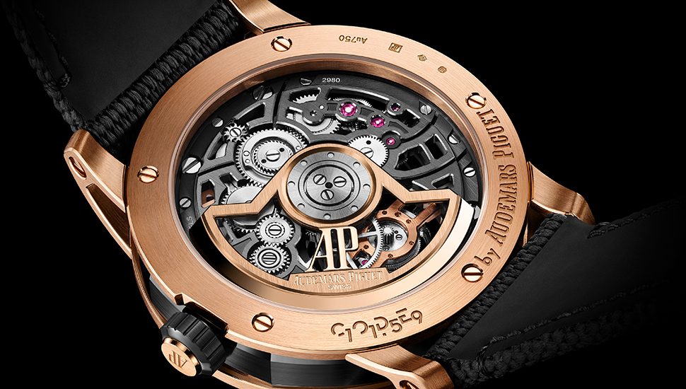 從機芯技術的角度來看,這次的亮點是全新Cal. 2980,它是Cal. 2972的升級版本,將前一代手上鍊機芯升級為自動機芯。它更把愛彼的另一拿手好戲:鏤空工藝應用其中,主夾板與橋板大量鏤空,摒除所有非必要部分,既保留完整結構功能,又讓光線自由穿透機芯。製作亦不容易,工匠先使用CNC數控加工技術裁切出部件,再運用EDM工藝精雕細刻,確保各個組件完美契合,製表師需要花費25小時親手組裝這枚鏤空機芯,手工潤飾的發條橋板上還點綴著6個標誌性V形倒角。