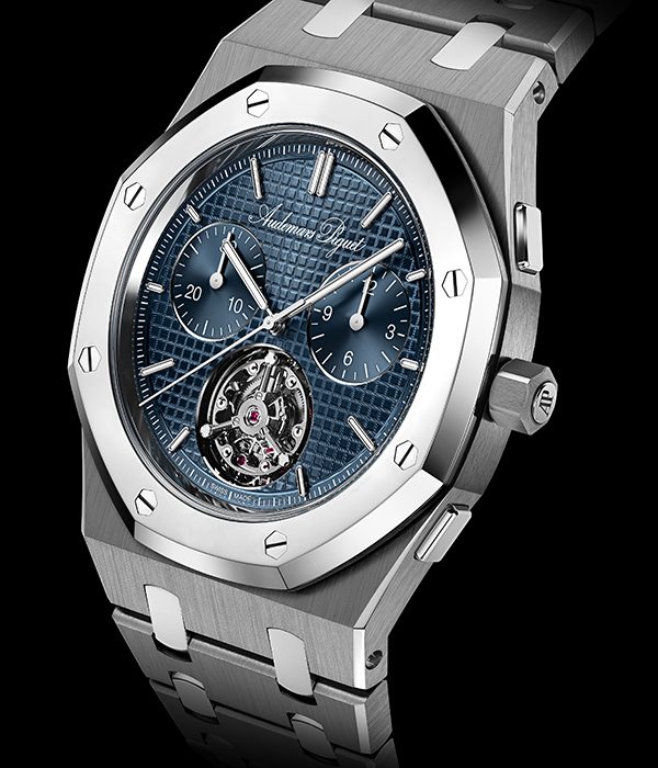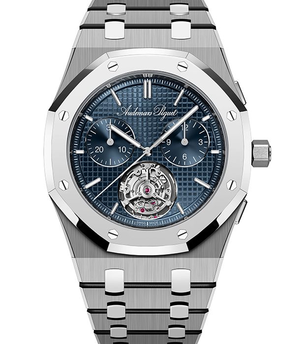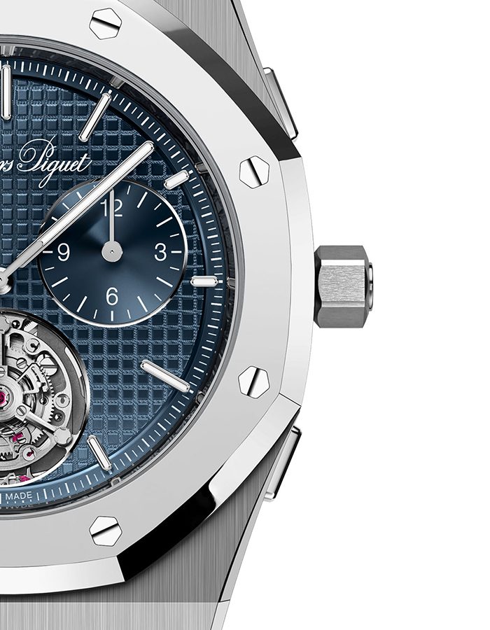 外觀方面,腕表選用39mm鈦金屬表殼與表帶,搭配稀有的塊狀金屬玻璃(BMG)表圈。BMG早在兩年前便應用於Royal Oak系列,具備更強的耐磨與抗腐蝕性能,並呈現獨特的鏡面金屬光澤。表盤為「雲夜藍50」色調搭配Petite Tapisserie小型格紋,3:00與9:00位置分別設有分鐘與小時計時盤,6:00位置為陀飛輪視窗,12:00位置飾有經典「Audemars Piguet」標誌。底蓋則鐫刻「1of 150 pieces」與「150」紀念字樣,全款僅限量150枚。