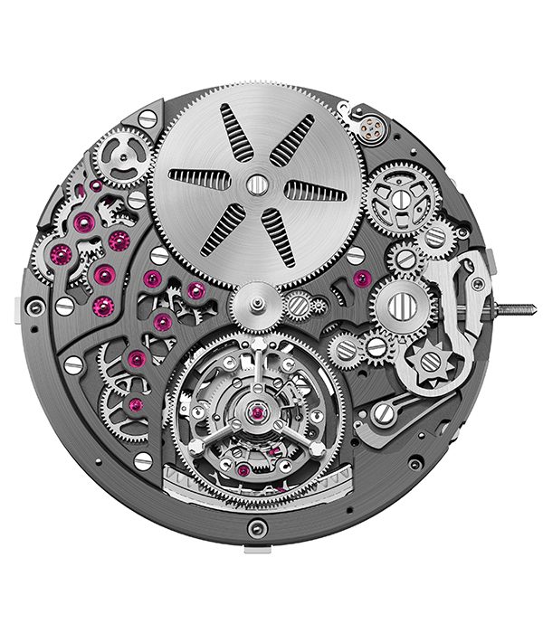 此次飛行陀飛輪基於RD#3的設計改造,維持原始比例但進一步減少厚度,並以機芯外緣帶動鈦金屬陀飛輪,提高能量分配效率。同時調整部分組件位置,並重新設計全新擒縱系統以提升穩定性與傳動效率。最終在各系統配合下,Cal. 8100機芯擁有72小時動力儲備,完全符合現代需求。
