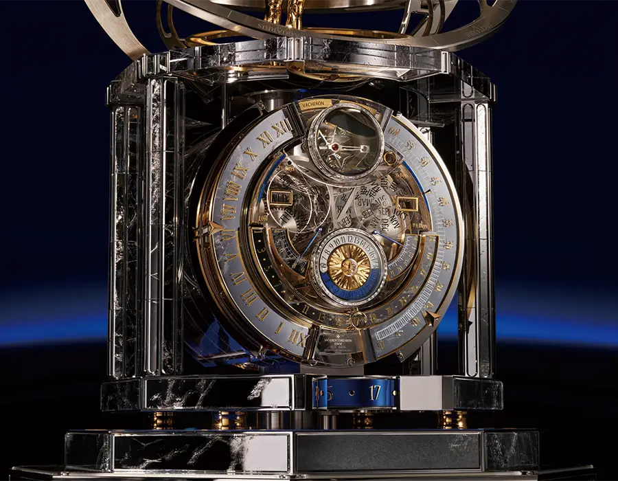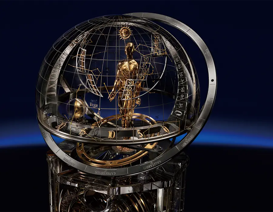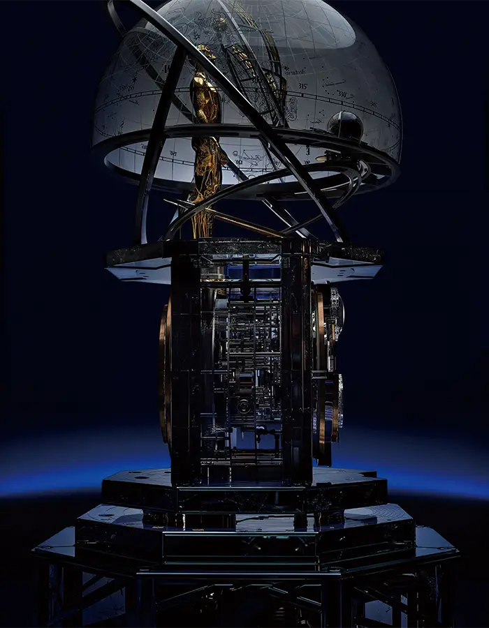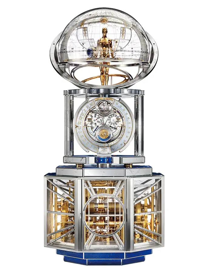 中間部份的天文鐘,設有正反兩面表盤。正面表盤是以4層水晶組成的萬年曆,月份和星期似傳統轉盤配合視窗在2:00和10:00位顯示,6:00位是兼具日夜顯示的24小時盤,在其左右是日出和日落時間,下方還有逆跳日期。12:00位是極盡搶眼的巨形陀飛輪,右側有個小巧的閏年視窗,下方是分左右各7天半的逆跳式15天動力儲備顯示,而小時與分鐘顯示設於表盤最外圍的左右兩側。至於背面的星空圖,會實時呈現星座的運動軌跡,還可測量恆星日和顯示季節,亦同樣具備逆跳式動力儲備顯示。至於以青金石模擬太空的八角形底座,以貝母刻記行星的名字,而內置的音樂盒功能會在機械人偶啟動時播放音樂。