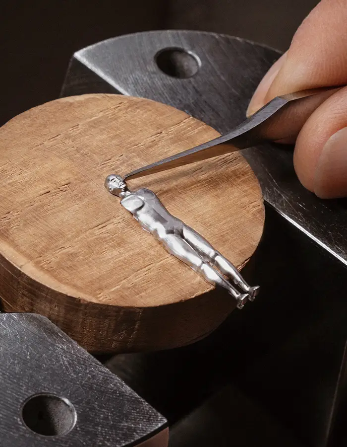 這個金色人偶以鈦金屬製造,覆以金色PVD塗層,再經過噴砂和手工舊化處理。然而,說它是普通人偶裝飾也不太恰當,應該稱呼它為聽從指令的顯時工具人,操作模式像愛馬仕的Time Suspendu或Van Cleef & Arpels的仙子系列,平常狀態指針(或手臂或裙擺)停留於特定位置,按掣啟動之後才會顯示當下時間。江詩丹頓的設計異曲同工,而且參照了他們2019年Traditionnelle Twin Beat Cal. 3610QP萬年曆機芯的模式,新款Cal. 3670手上鍊機芯以「靜待」和「活躍」兩種不同頻率運作,靜待模式時走時功能僅在背後運作,人偶雙臂自然垂於兩側,直至佩戴者按下10:00位置的按鈕,雙臂才會提起指示正確時間,假如再按下按鈕,雙臂又會重回起初的垂下靜止狀態。