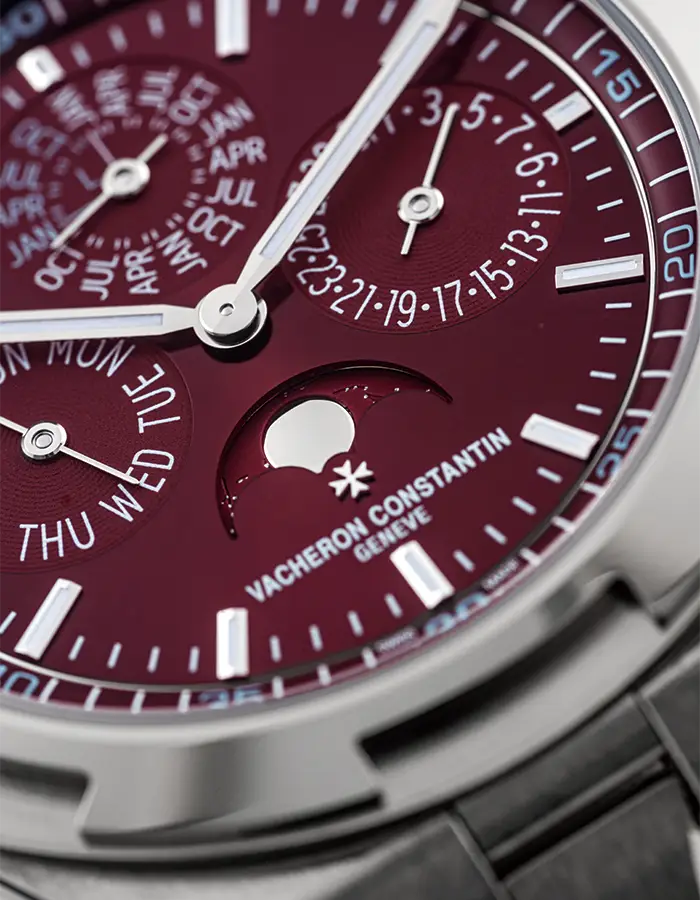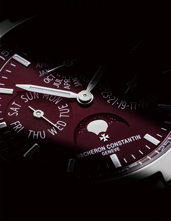超薄萬年曆的表殼直徑是41.5mm,對比大三針和Dual Time的41mm只是大了0.5mm,以其配備複雜的萬年曆和月相等多個功能顯示計,這個尺碼其實還算得上小巧。至於表殼的8.1mm厚度,儘管並非全球最薄,但依然是市場上最纖薄的萬年曆腕表之一,佩戴上手還是可以感受到腕表尺碼的恰到好處,貼服而舒適,而且所搭載的1120 QP/1機芯還是自動款式,十分方便於日常生活使用,這亦匹配Overseas本身作為運動表系列的設計原意。