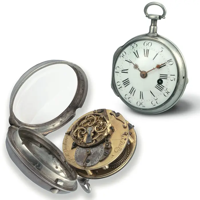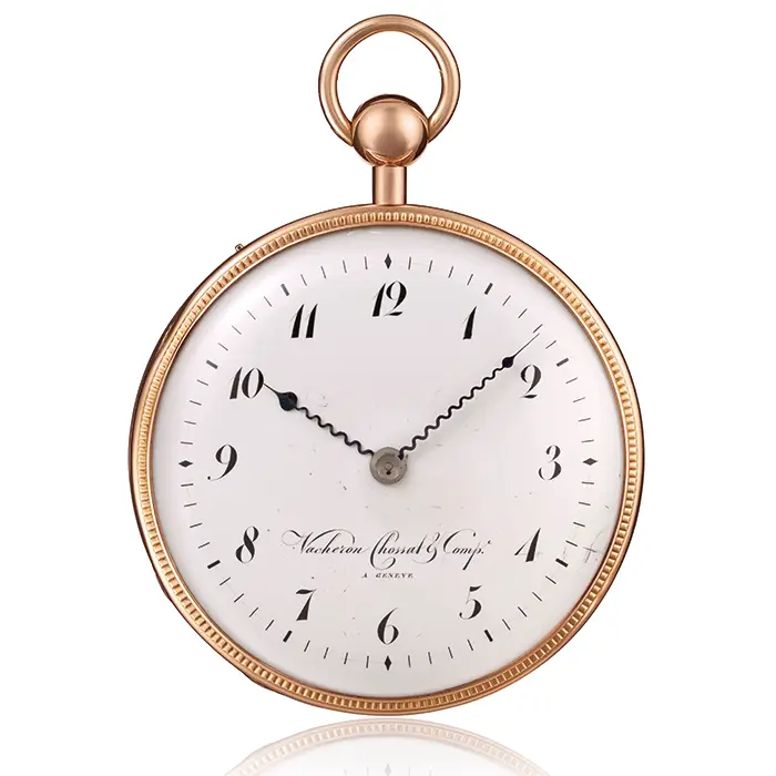 這枚純銀袋表的機芯刻有「J. M: Vacheron A GENEVE」字樣,是現今已知最早亦是唯一標誌著品牌創辦人名字的時計。機芯的擺輪夾板裝飾有精美的阿拉伯式藤蔓花紋,這種兼顧美學的工藝水準,成為了日後品牌的標誌性特徵。